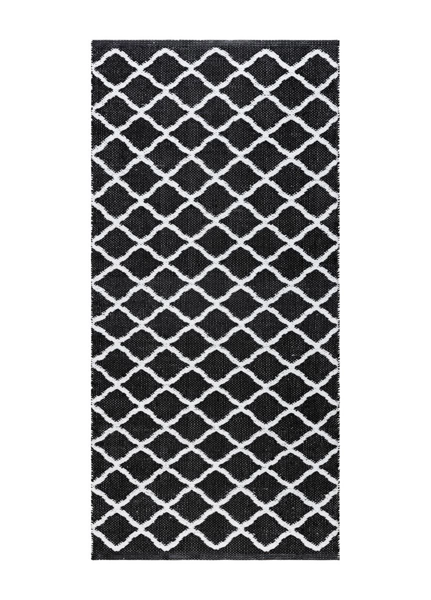 Plastmatta Mimmi Dalli Svart ger ett stilrent och grafiskt uttryck. Handvävd i PVC på bomullsvarp, är mattan både tålig och mjuk att gå på.